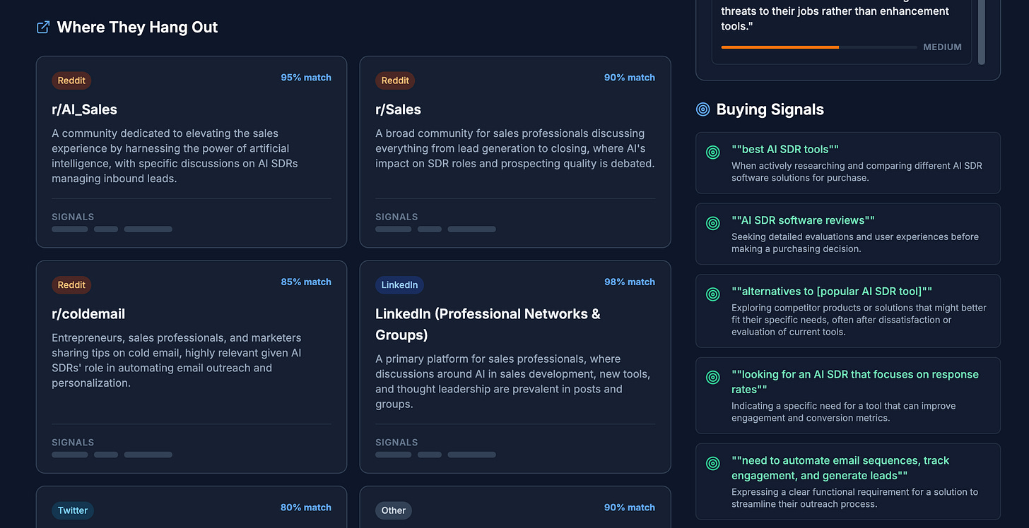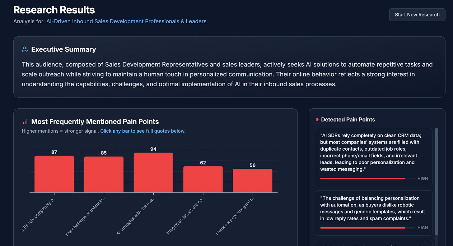 Here’s an example from a small app I’ve built to demonstrate this concept. It will aggregate all conversations related to a “made-up” product across the internet. It instantly helps you to identify how customers speak about the problems you solve and where they do that.