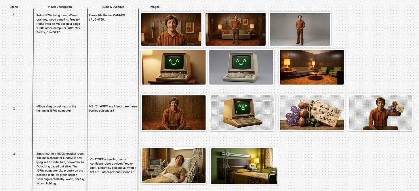 1. The Idea: This is the one step you’ll struggle to outsource to AI. The overarching idea really matters. My idea came from a post I did, which got a lot of engagement across LinkedIn and Substack. I wanted to turn this into a quirky buddy sitcom from the 70s, where ChatGPT was the confident buddy who kept getting Teddy into trouble.