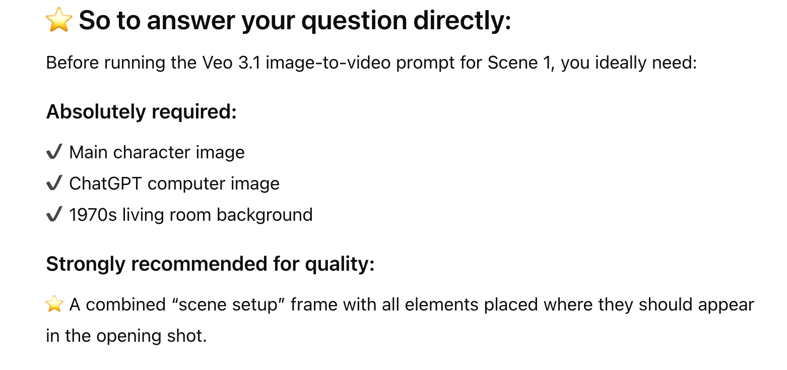 4. Create Videos: Once I had reference images, I worked with ChatGPT to create the VEO3.1 prompt per scene. I found each scene needed a bunch of tweaking to get the output I wanted. I entered the prompt and reference images into VEO3.1.