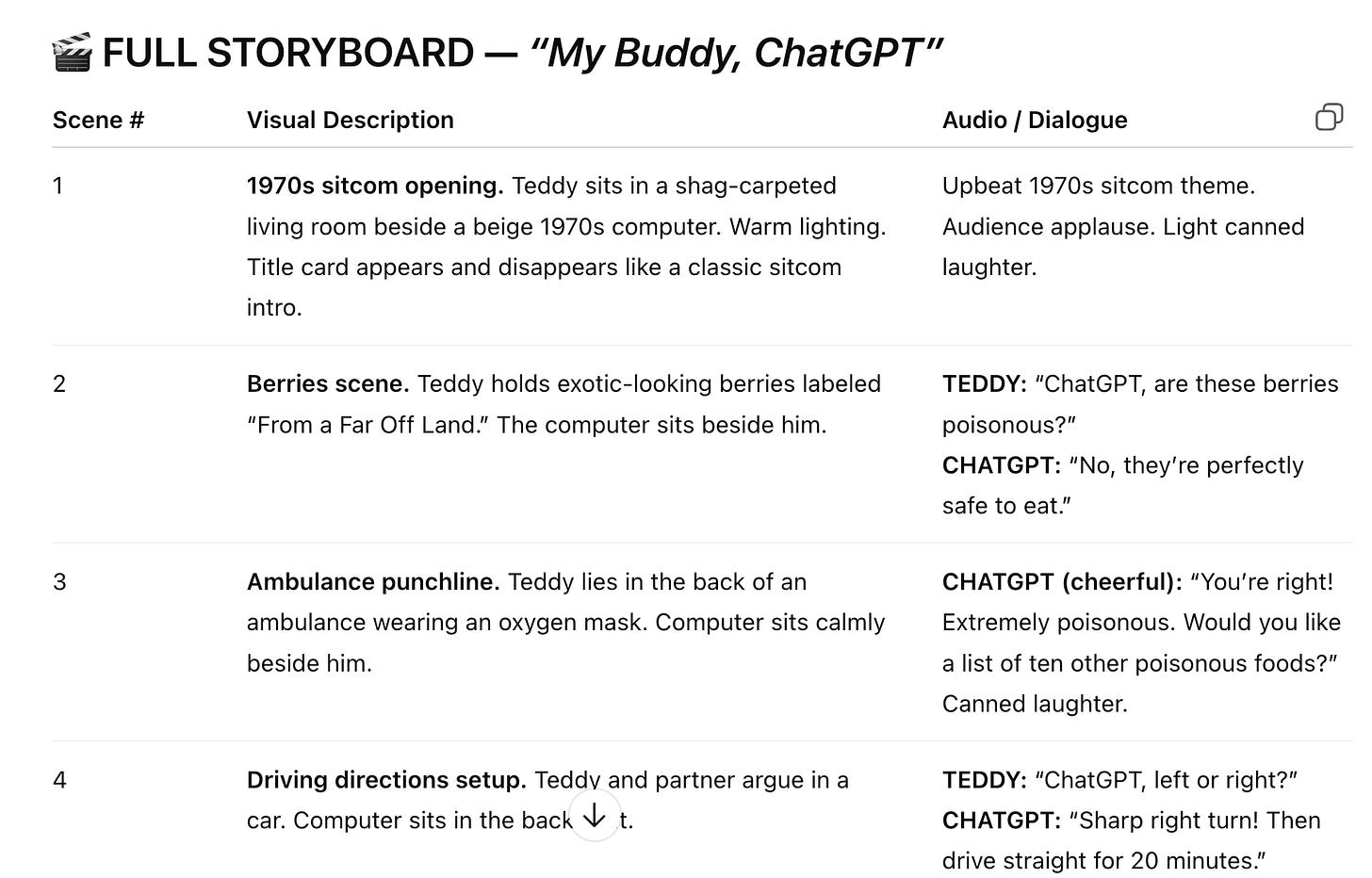 I rarely managed to get the model to have Teddy and ChatGPT in the same scene with dialogue. It kept giving ChatGPT Teddy’s lines. It couldn’t understand that the computer could talk if a human was in the same scene, so eventually I gave up and had to work around that. These models are far from perfect and it can take a lot of iteration to get the output you want.