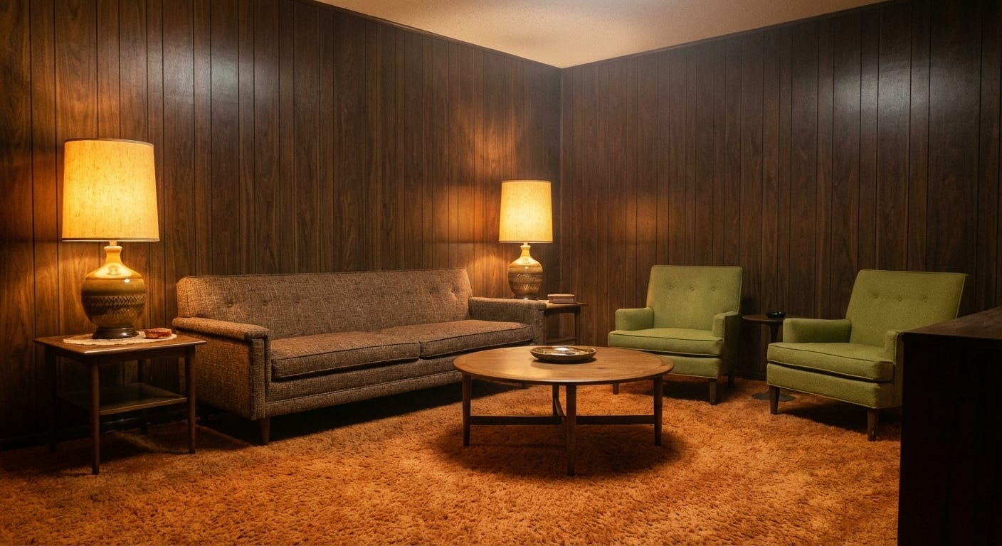 The room features shag carpet, a low vintage couch, a wooden coffee table, and warm earth-tone colors (browns, oranges, muted yellows). Include retro decor such as patterned curtains, a standing lamp with a fabric shade, framed wall art, and subtle wood paneling.