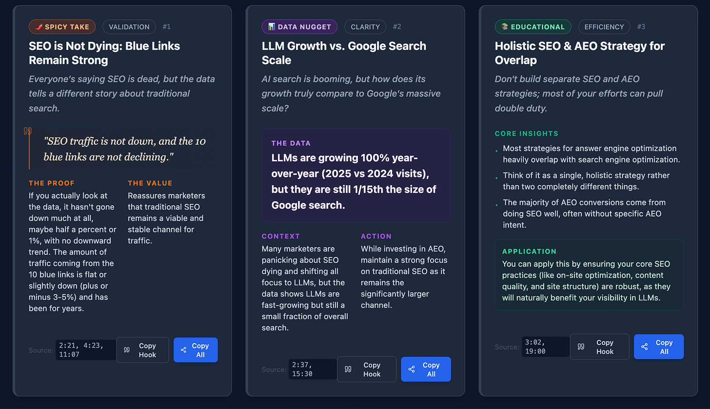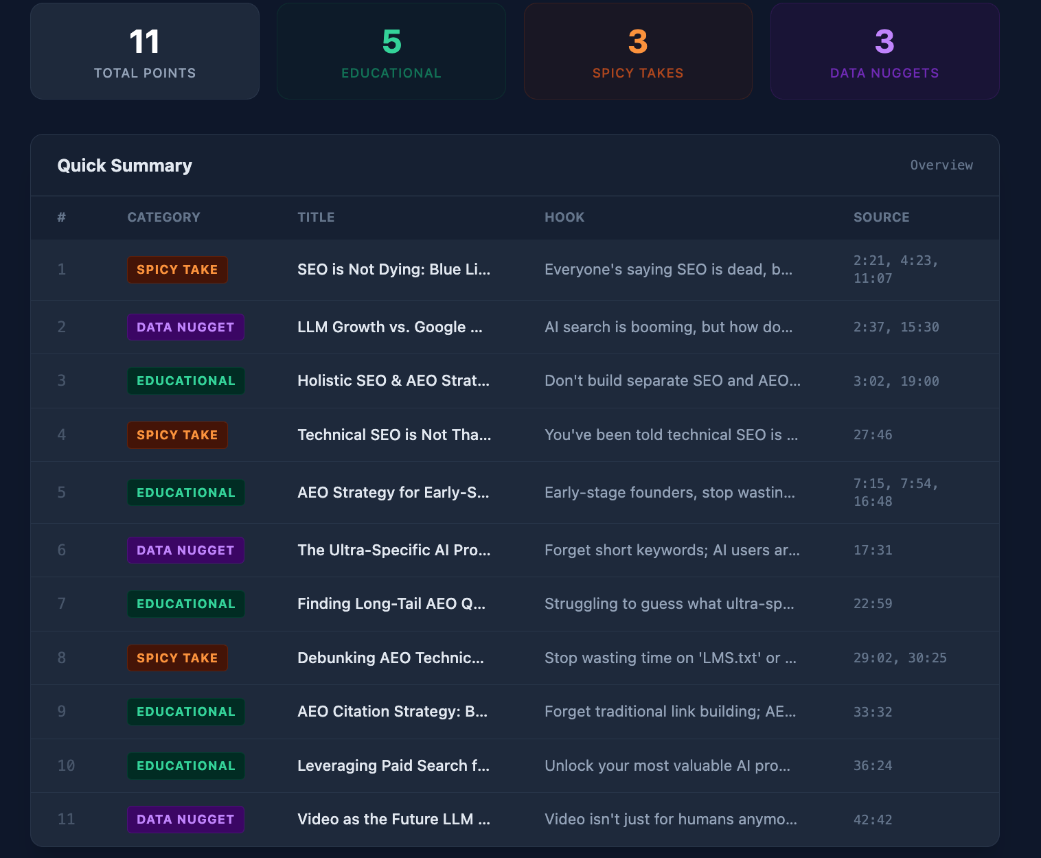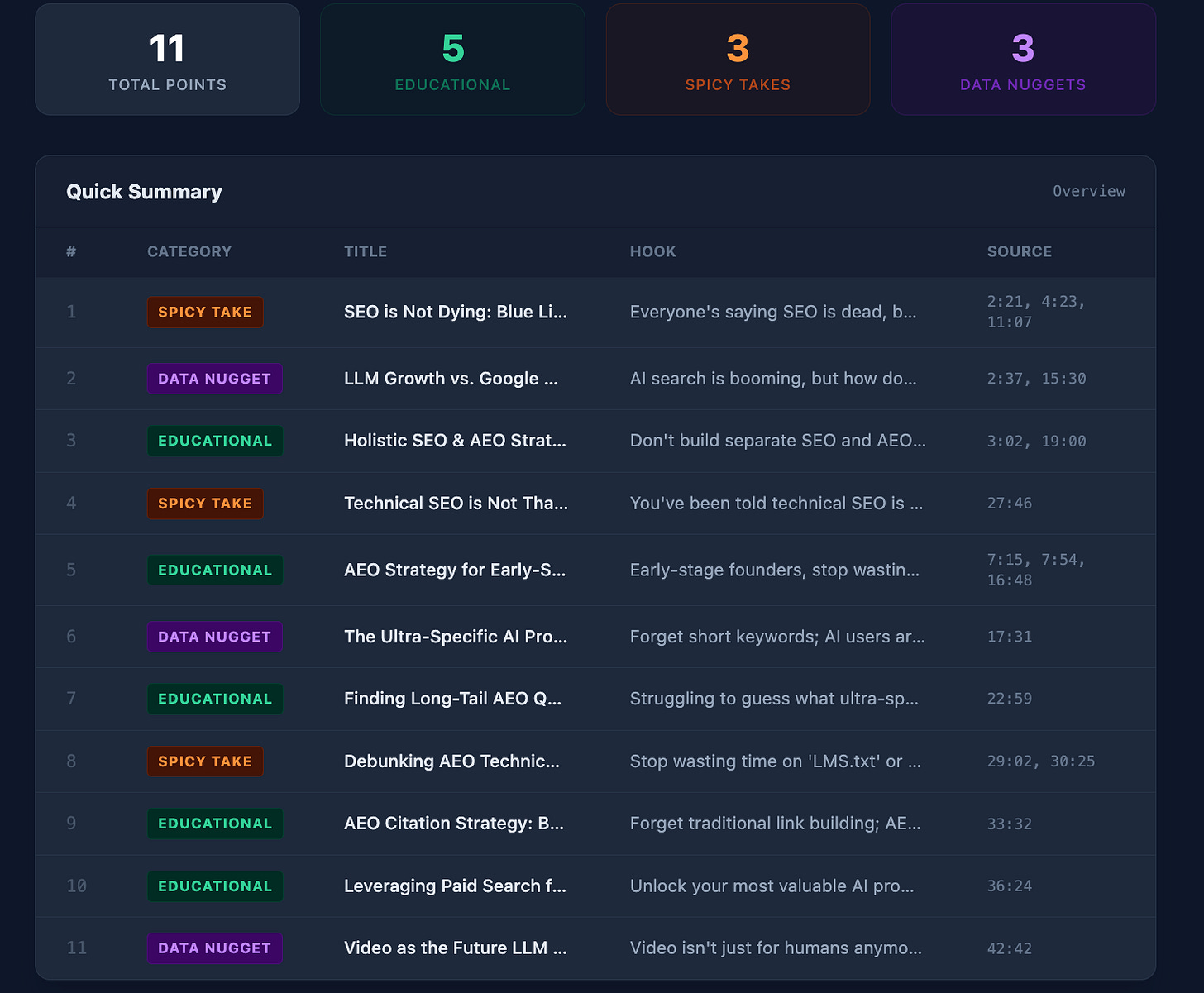 **Your Task:** Watch/read the transcript and identify all snippets that qualify as one of three talking point types: EDUCATIONAL, SPICY TAKE, or DATA NUGGET. Categorize and structure each one according to the specifications below.