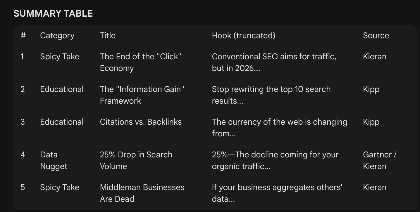 The output is really good. Here’s an example of one talking point it gave for {{Marketing Against the Grain}} {{The 2026 AEO Rules: How to Rank on GPT with ‘Citations’ Instead of Links}}.