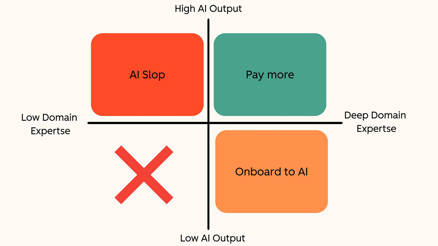 Top right → Pay them more. High AI output + deep domain expertise. These people know their craft, and they’re using AI to multiply it. They understand what “good” looks like, so they can direct AI toward good outputs. They use AI as a thought partner, not a copy-and-paste machine. These are the people operating in AI mode.