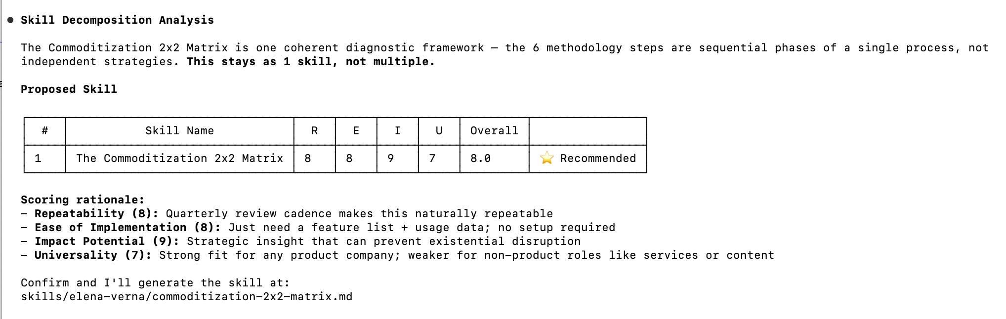 Then it scores each resulting skill on Repeatability, Ease of Implementation, Impact Potential, and Universality.