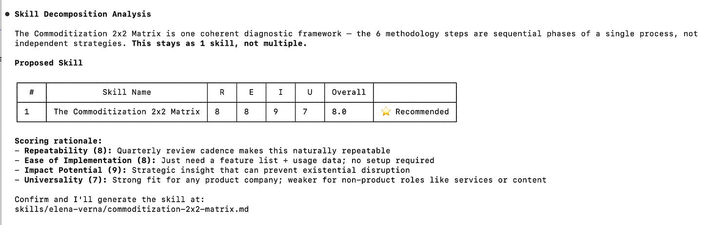 The highest scorer gets recommended. You confirm what you want built. It generates a markdown skill file, ready to run in Claude Code.