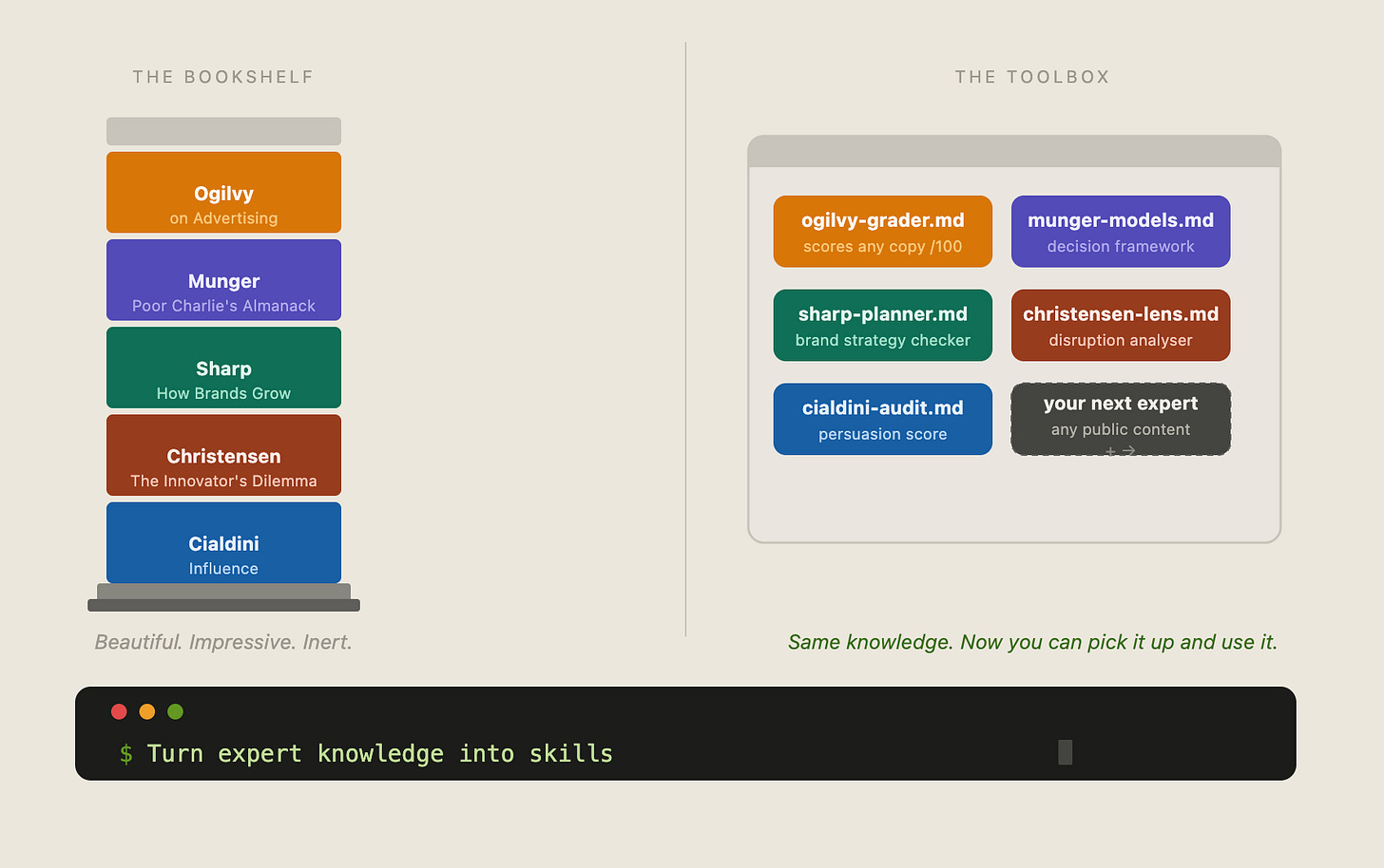 Here’s the shift: every piece of expert content is now a functional brief for Claude Code. A newsletter, a YouTube transcript, a podcast episode. This system can aggregate an experts lessons, extracts the best lessons, and turns them into a skill.md file you can run on demand.