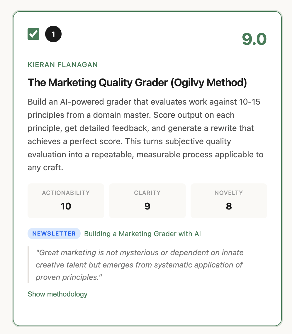 Any expert's public methodology can become a reusable AI workflow. The knowledge doesn't have to sit inert in a newsletter you'll never reread. It can become something you run. Every piece of content is now a functional brief.