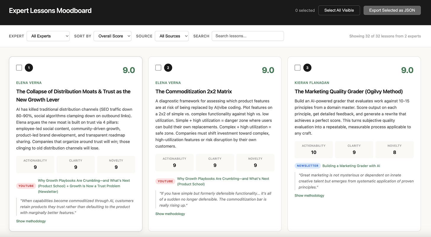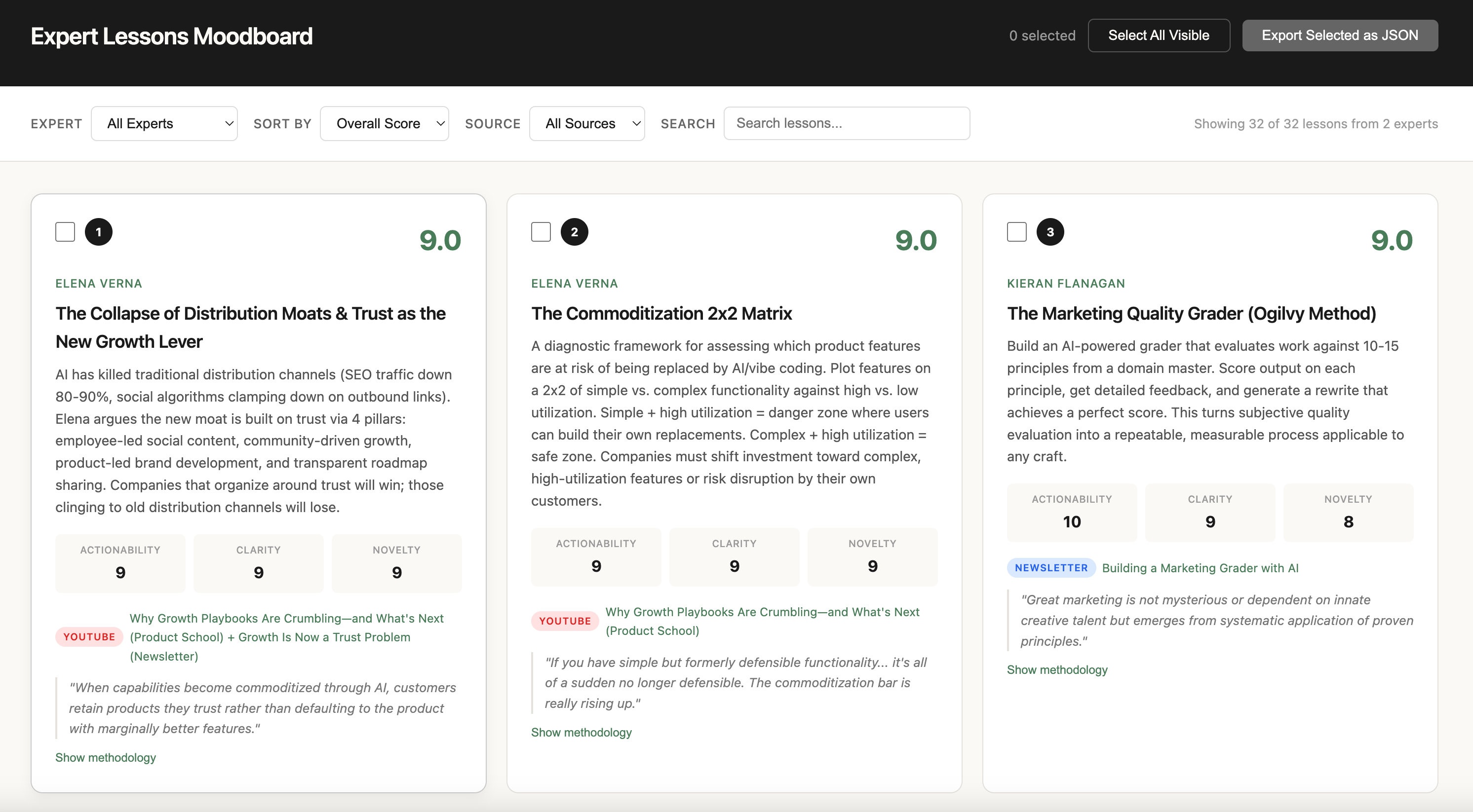 It surfaces the top 10 in an interactive moodboard you open in your browser, filterable by source type and sortable by any score dimension. You pick the lessons you want to convert and export them as JSON.