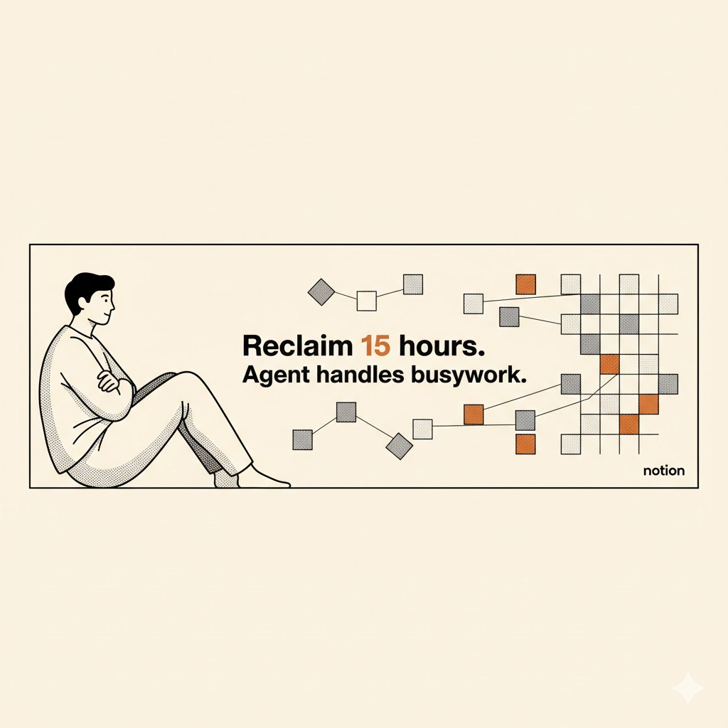 “14’x48’ horizontal billboard, full bleed, ultra high resolution. Extreme minimalist composition with vast negative space, warm off-white background (#F1F1EF). Roman Muradov-style line art: calm figure in side profile, seated with arms crossed, soft black ink lines with halftone shading, no skin tones, gazing right. Floating geometric Notion blocks cascade left-to-right, transitioning from chaotic scatter to perfect alignment via delicate thin lines. Clean sans-serif typography, Inter Bold style: “Reclaim 15 hours. Agent handles busywork.” in pure black (#000000) with “15” in desaturated burnt orange (#B45309). Tiny Notion wordmark bottom-right in Articulat CF style. Monochrome palette, single accent color, professional billboard quality, high contrast, readable at distance.”