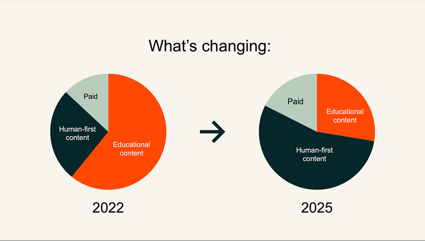 We were early on this trend. At HubSpot we bet early on human-led media (e.g., The Hustle acquisition). That mix now drives more demand than branded content. Huge Shift.